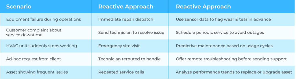 Proactive field service focuses on prevention. Rather than waiting for something to break, technicians are deployed based on data, performance insights, and asset history.